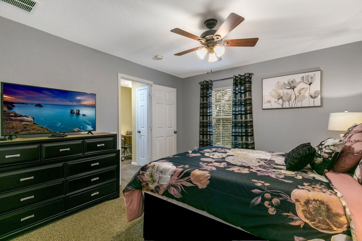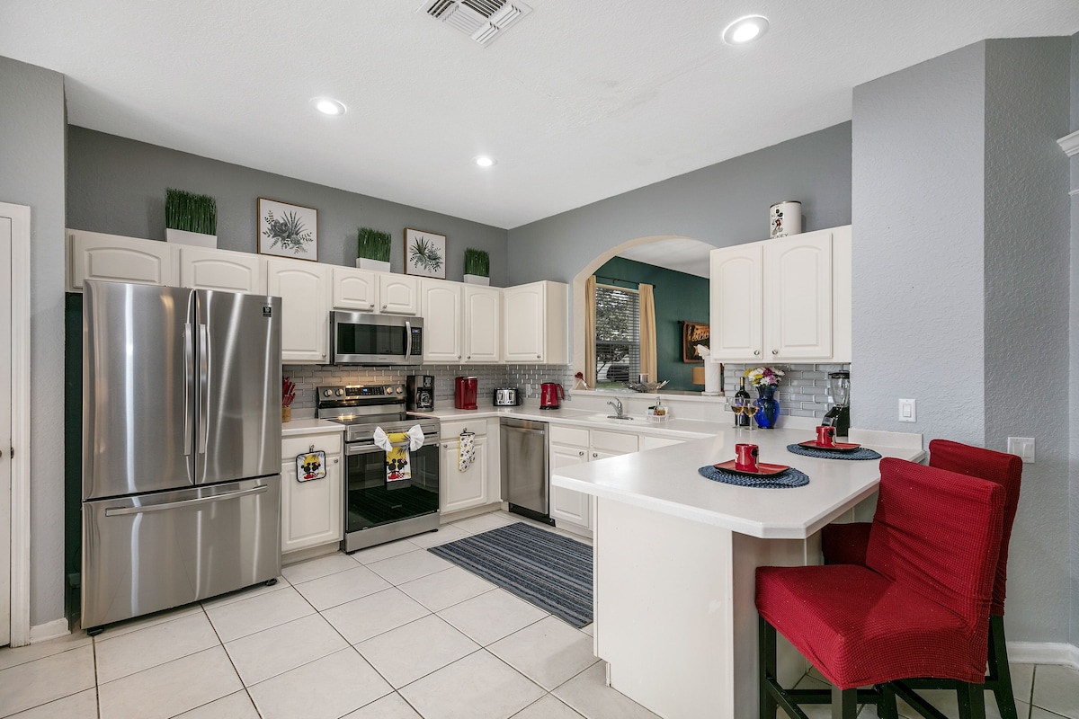 Are you tired of looking for a home? Too many to choose? Many look the same? Please continue to read because if you are looking for a TRULY luxurious home (and NOT the typical rental home with lower quality furnishing and home decor), at a great value then you would be very pleased with your choice in one of our homes. This is your vacation and you want it to be a wonderful memory. The decor and furnishings in a home do make a world of difference as all of this home's guests have experienced. No need to pay for just mediocre accommodations. If you appreciate quality furnishings and comfort then you and your family will be very pleased with Story Time Home, you will enjoy high end furniture, pillow top mattresses, higher thread count on sheets, high quality comfortable pillows and towels, custom shower heads, your own screened-in pool and spa with child safety fence, and other thoughtful details of home. You cannot find a closer resort community to Disney, just 1.5 miles away in the highly demanded exclusive guarded/gated community of Windsor Hills. You will love your screened-in private pool and spa with an extended lanai area. All bedrooms are equipped with the most comfortable pillow-top mattresses, ceiling fans, LCDs with cable TV. Three of the bedrooms are decorated as Disney theme rooms. HOME EQUIPPED WITH CHILD SAFETY FENCING AROUND POOL.